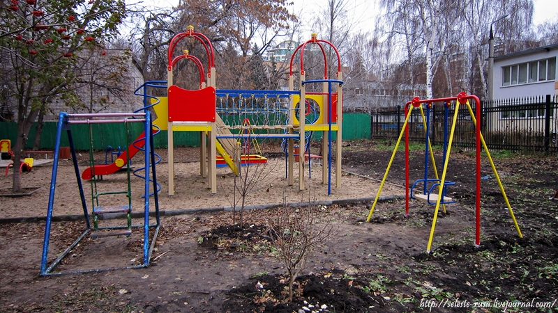 4. Старые качели и новая детская площадка, появившаяся недели две назад. Сначала разровняли площадку и наши жители начали гадать, для чего его делают, и кто, потому что всякие действия во дворе и в парке вызывают живейший интерес